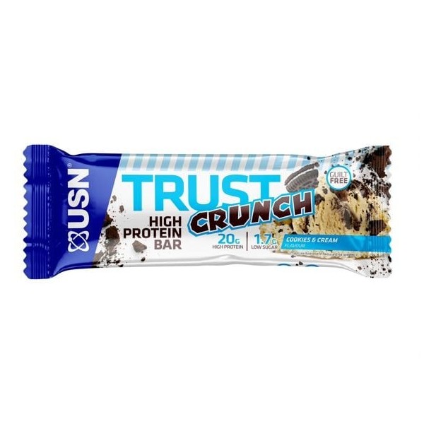 USN Trust Crunch 60g to bardzo smaczny, wysokobiałkowy batonik o niskiej zawartości cukru oraz tłuszczu, który charakteryzując się zwiększoną zawartością białka, w prosty sposób wspomaga wzrost lub utrzymanie masy mięśniowej na właściwym poziomie.