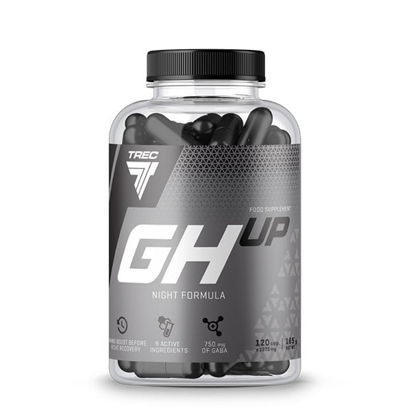 TREC GH UP 120kaps. - suplement diety. NOCNA FORMUŁA. GH UP to kompozycja form aminokwasów, które wchodzą w skład łańcucha polipeptydowego somatotropiny. GH UP zawiera L-argininę, L-ornitynę i L-lizynę oraz jabłczan cytruliny. Produkt uzupełniono także o kwas gamma-aminomasłowy, L-tryptofan, DAA oraz L-glicynę. GH UP to produkt polecany jako środek uzupełniający aminokwasy przed okresem nocnej regeneracji.