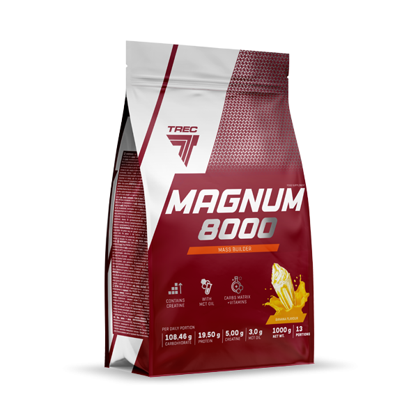 Trec Magnum 8000 - produkt/odżywka na masę typu "gainer", którego zadaniem jest wesprzeć odpowiednią ilość węglowodanów oraz białka w codziennym jadłospisie. Oczywiście podnosi także ogólną kaloryczność prowadzonej diety. Formuła produktu obejmuje zróżnicowane źródła węglowodanów oraz protein, które zostały wzbogacone o kompleks witaminowy, MCT i kreatynę.
