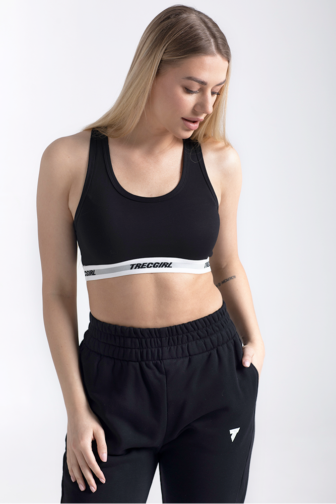 BASIC TRECGIRL SPORT BRA 120 BLACK to sportowy biustonosz, który wykonany jest z najwyższej jakości bawełny z dodatkiem elastanu. Takie połączenie tkanin sprawia, że stanik idealnie układa się na ciele i podtrzymuje biust. Dzięki gumie umieszczonej pod biustem, stanik nie przesuwa się i zapewnia komfort zarówno w trakcie treningu, jak i na co dzień.