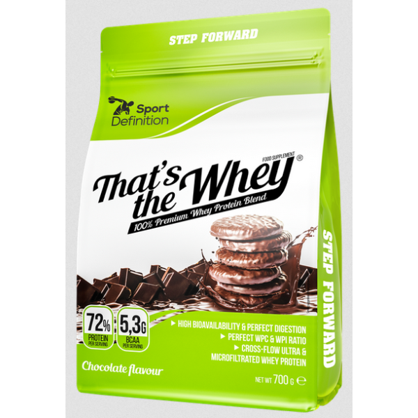 Sport Definition That's The Whey - jest to produkt stawiający na skład, ale także smak i rozpuszczalność (surowiec jest instanizowany). Formuła odżywki opiera się o koncentrat białek serwatki oraz izolat (WPC + WPI). Charakteryzuje się także wysoką zawartością aminokwasów rozgałęzionych (BCAA) oraz esencjonalnych (EAA).