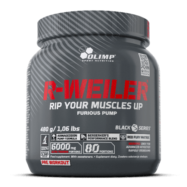 Olimp R-weiler 480g - najwyższej jakości preparat stworzony z myślą o stosowaniu go przed każdym treningiem. Łączy w sobie zalety kilku form kreatyny o niezwykle anabolicznych właściwościach, mieszanki pomperów (prekursorów NO), jak i szeregu mikroelementów i ekstraktów roślinnych o wysokich standaryzacjach na zawartość pożądanych substancji aktywnych. Każda porcja to zatem realne wzmocnienie mięśni, jak i poprawa osiąganych przyrostów suchej tkanki mięśniowej. Sprzyja również znacznej poprawie pompy mięśniowej, która nie tylko wpływa na zwiększenie motywacji, ale także usprawnia procesy regeneracyjne - dzięki lepszemu odżywieniu i dotlenieniu tkanek. Jest to możliwe za sprawą poprawy ukrwienia i zwiększenia przepustowości naczyń krwionośnych. Jak widzisz, jest to przemyślany produkt, którego wielotorowe działanie niesie za sobą wiele korzyści.