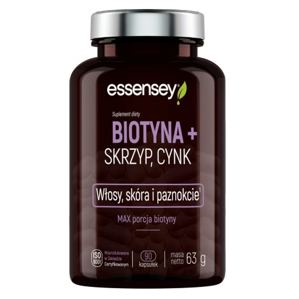 ESSENSEY BIOTYNA + SKRZYP, CYNK - wysokiej jakości suplement stworzony z myślą o osobach pragnących wesprzeć stan skóry, włosów, paznokci, ale i prawidłowe funkcjonowanie układu immunologicznego. Jego walory wynikają wprost z zawartych w składzie substancji aktywnych (biotyny, skrzypu oraz cynku) w starannie dobranych proporcjach. Sprawdzi się celem dopięcia profesjonalnej suplementacji nakierowanej na kompleksowe wsparcie organizmu.
