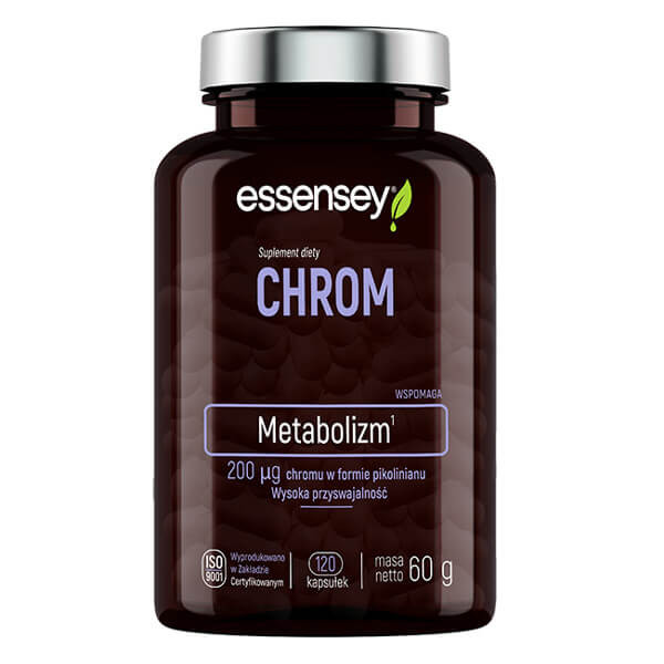 ESSENSEY CHROM NA METABOLIZM - suplement na bazie chromu (Cr), którego pozytywny wpływ na organizm i prawidłowe funkcjonowanie przemian metabolicznych makroskładników odżywczych jest trudny do przemilczenia. Sprzyja utrzymaniu prawidłowego poziomu glukozy we krwi, co samo w sobie ogranicza zjawisko napadowej chęci podjadania. Często jest składnikiem suplementów tworzonych dla osób odchudzających się. Oferowany produkt występuje w postaci łatwych do połknięcia kapsułek.