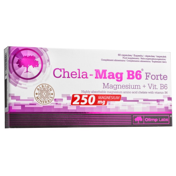 Olimp Chela Mag B6 Forte - każda porcja to bogate źródło magnezu w jego bardzo dobrze przyswajalnej formie (chelatu aminokwasowego). Dodatkowo zawiera witaminę B6 dla zachowania kompleksowego działania suplementu. Magnez jest minerałem odpowiedzialnym za prawidłowe funkcjonowanie układu nerwowego, pracę mięśni oraz utrzymanie dobrego samopoczucia. Niestety często występują jego niedobory, które mogą być spowodowane między innymi zwiększoną aktywnością fizyczną i nieuwzględnieniem jej wpływu na potrzeby organizmu oraz częste picie kawy, która jest znana z tego, że po prostu go wypłukuje. Preparat polecany jest w głównej mierze osobom aktywnym.